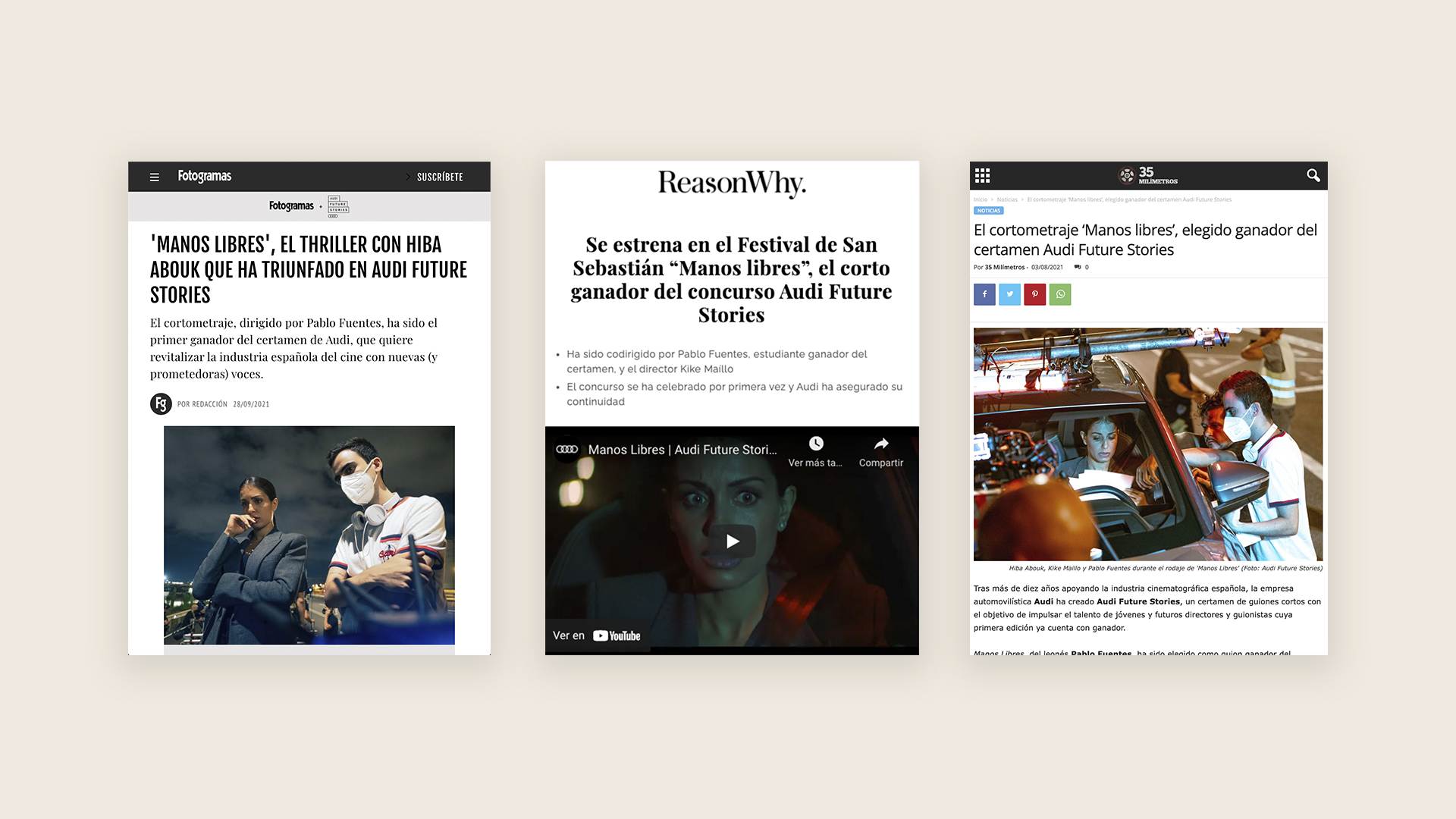 Audi has been supporting Spanish cinema for more than 10 years, and has created Audi Future Stories to promote future directors and screenwriters. A short script contest that already has a winner, leading actress and filming date. Hiba Abouk heads the cast of “Manos Libres”, a script with which Pablo Fuentes, from the TAI School, from Leon, has won over the jury of the contest.